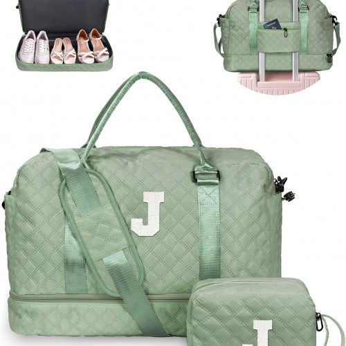 Initial Duffle with Shoe Compartment, Personalized Weekender Bag with Shoulder Strap, Overnight Travel Bag with Makeup Pouch for Women (Letter E)