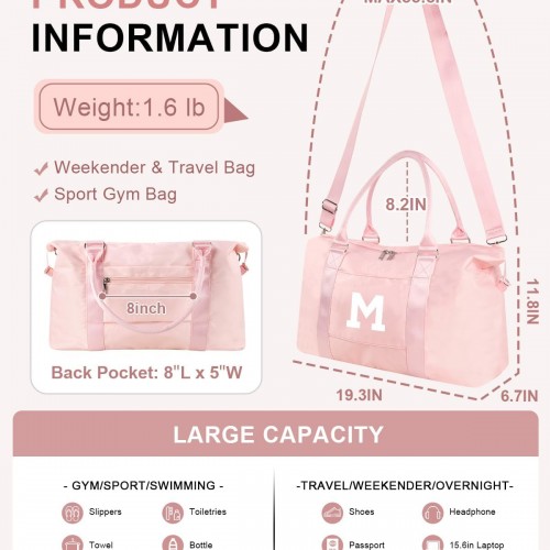 Initial Travel Duffel Bag Sports Gym Bag for Girls Teen Birthday Gifts,Pink Personalized Weekender Bag Carry On Tote Bags for Women Men,Waterproof Overnight Luggage Bag with Trolley Sleeve(Letter M)