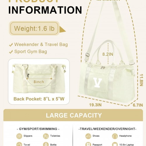 Initial Travel Duffel Bag Sports Gym Bag for Kids Teen Birthday Gifts,Beige Personalized Weekender Bag Carry On Dance Bags for Women Men,Waterproof Monogram Overnight Bag with Trolley Sleeve(Letter V)
