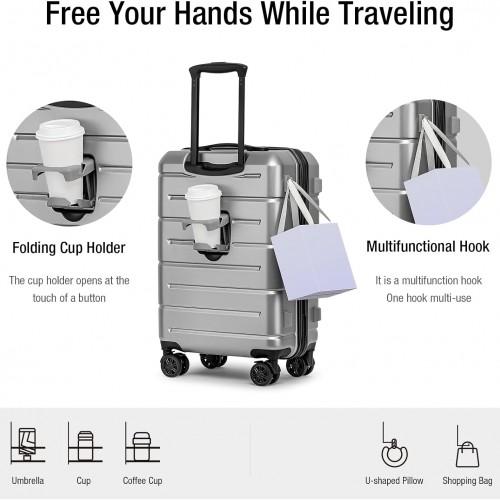KYME Carry On Luggage 22x14x9 Airline Approved with Cup Holder Hardside Carry On Suitcase with Spinner Wheels Hardshell Travel Rolling 22 Inch Luggage with TSA Lock for Women Men Silver
