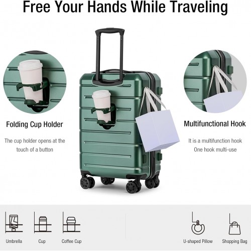 KYME Hardside Carry On Luggage 22x14x9 Airline Approved with TSA Lock Hardshell 22 Inch Suitcase with Spinner Wheels Small Travel Rolling Luggage with Cup Holder for Men Women Green