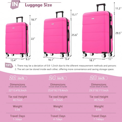 Merax Luggage Sets of 3 Piece Carry on Suitcase Airline Approved,Hardcase Suitcase Set with Double Spinner Wheels,Pink