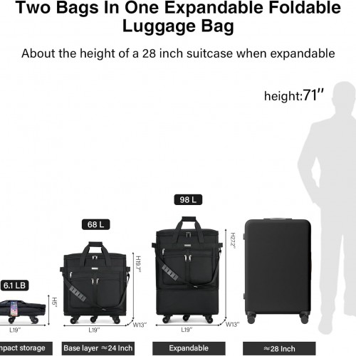 MILADA Expandable Luggage Bags for Travel Foldable Suitcase with Wheels Collapsible Rolling Travel Duffle Bag Lightweight Large Suitcases without Telescoping Handle, Black