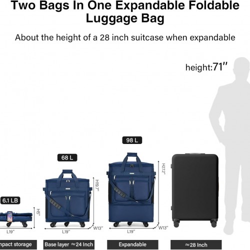 MILADA Expandable Luggage Bags for Travel Foldable Suitcase with Wheels Collapsible Rolling Travel Duffle Bag Lightweight Large Suitcases without Telescoping Handle, Blue
