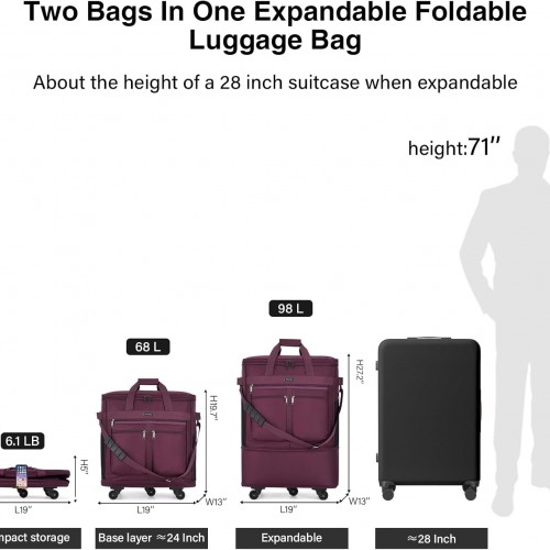 MILADA Expandable Luggage Bags for Travel Foldable Suitcase with Wheels Collapsible Rolling Travel Duffle Bag Lightweight Large Suitcases without Telescoping Handle, Purple