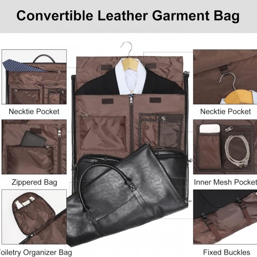 - 45L-LARGE CAPACITY with SHOES COMPARTMENT: After assembled, this garment duffel bag work perfect as a 45L duffel bag/travel weekender bag, which is with back strap for luggage. At the right side pocket of this leather garment bag is a shoes pouch. And the left side pocket is designed for passport, keys and some other small items. Besides, Convenient One front pocket will be good for Quick access