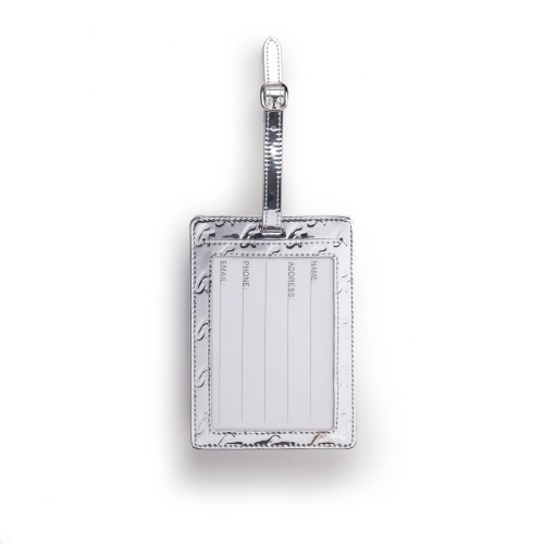 Strut the airport in style with a designer tag that helps you easily keep track of your luggage. Delicately stamped with our signature G and wrapped in smooth vegan leather, this tag is equipped with an adjustable buckle strap and a clear ID window.
