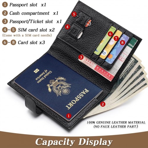 - Suitable Capacity: 1 passport slot, 1 ticket slot, 3 card slots, 2 Sim card slots, 1 cash compartment, 1 zipper coin pocket—keeping your essentials neatly organized.