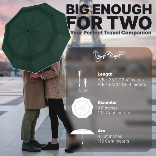 Royal Walk Windproof Folding Travel Umbrella Compact and Strong Luxurious Real Wood Handle Automatic Open Close Vented Double Canopy for Men and Women