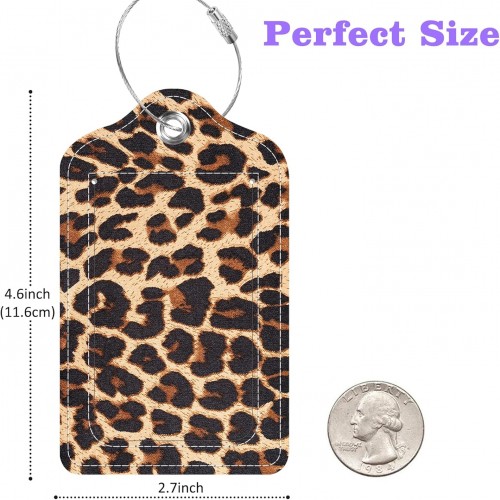 Set of 2 Luggage Tags Brown Leopard Texture Leather Suitcases Tag with Privacy Cover Stainless Steel Loop and Address Card for Women Men Travel