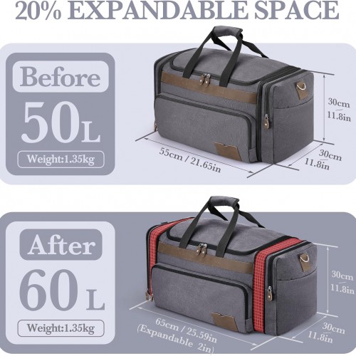SHOWKOO Duffle Bag for Travel 60L Expandable Canvas Travel Bag Durable Vintage Weekender Overnight Carry On Bag for Men(Dark Gray)