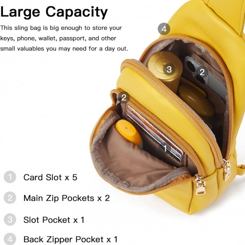 - Multi-functional: Comes with two main compartments, including five card slots in the front zip pockets, and a big slot pocket in the back. Moreover, there also have an anti-theft zipper pocket in the back to keep your belongings secure. This leather sling bag is the perfect everyday essential. It’s just big enough to store your keys; phone; wallet; passport and other small valuables you may need for a day out, allowing you to move freely while having quick and easy access to your belongings