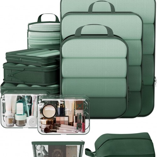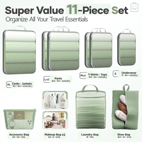 - All-in-One Organization for Your Travel Needs – This 11-piece set includes six compression cubes (S/M*2/L*2/XL) for systematic packing: S for underwear/socks, M for T-shirts and shirts, L for jeans and light sweaters, and XL for coats or bulky items. Also features two PVC toiletry/makeup bags, a machine-washable laundry bag, a shoe bag, and a multi-purpose zippered pouch—keeping your luggage tidy and efficient.
