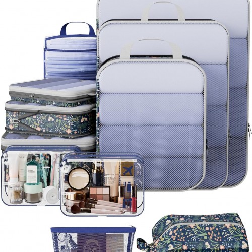 - All-in-One Organization for Your Travel Needs – This 9-piece set includes four compression cubes (S/M/L/XL) for systematic packing: S for underwear/socks, M for T-shirts and shirts, L for jeans and light sweaters, and XL for coats or bulky items. Also features two PVC toiletry/makeup bags, a machine-washable laundry bag, a shoe bag, and a multi-purpose zippered pouch—keeping your luggage tidy and efficient.