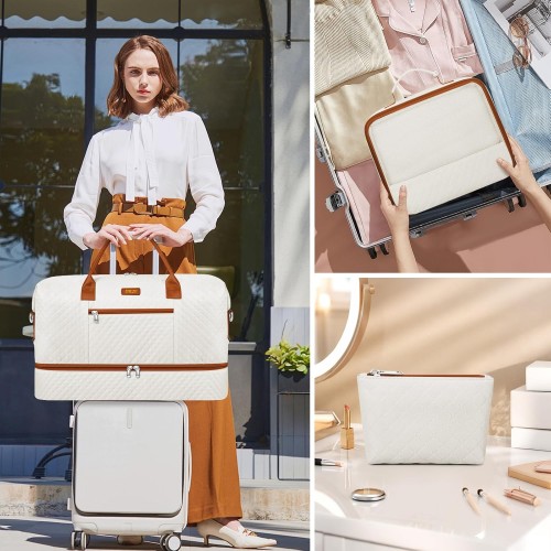 - [Separate Shoes/Clothes Compartment] Separate flat bottom compartment of this duffle bag women can hold your shoes or dirty clothes for easy separation from clean clothes when traveling.If you’re a novice mother, the bottom part is also perfect for storing diapers/wipes/diaper bag items. It can also be used as a hospital bag,mommy bag and medical bag. Shoes compartment size: 21″L x 11″W x 3.2″H.
